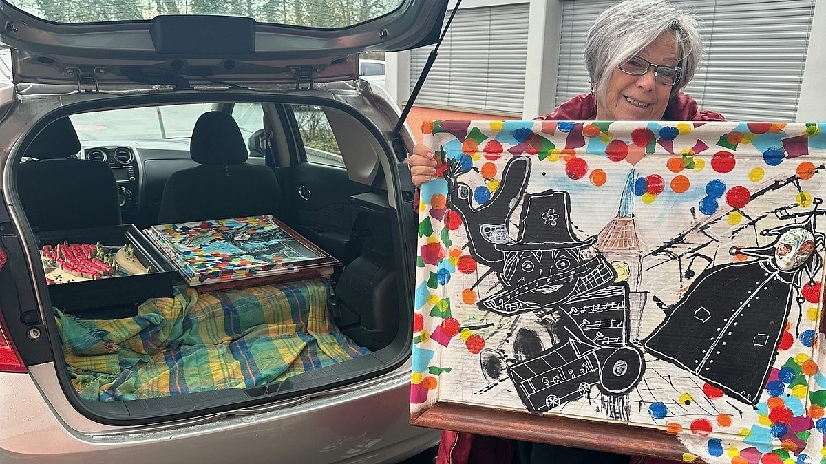 Die Kunstwerke aus unserem Atelier wurden von Christine Schläppi, Mitglied im Verein Berner Fasnacht, zur Verteilung in den Restaurants, abgeholt.