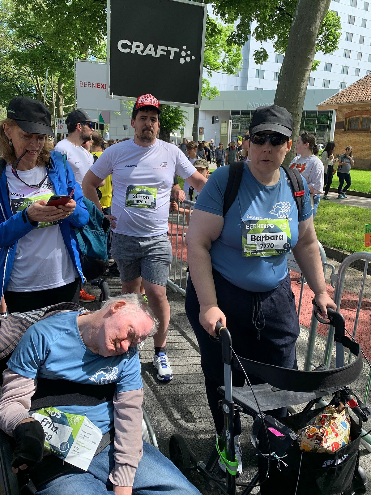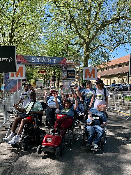 Zu Fuss, im Elektro- und Handrollstuhl und am Rollator haben 10 Klient:innen die 1,6 km lange «Einstiegsmeile» erfolgreich bezwungen.