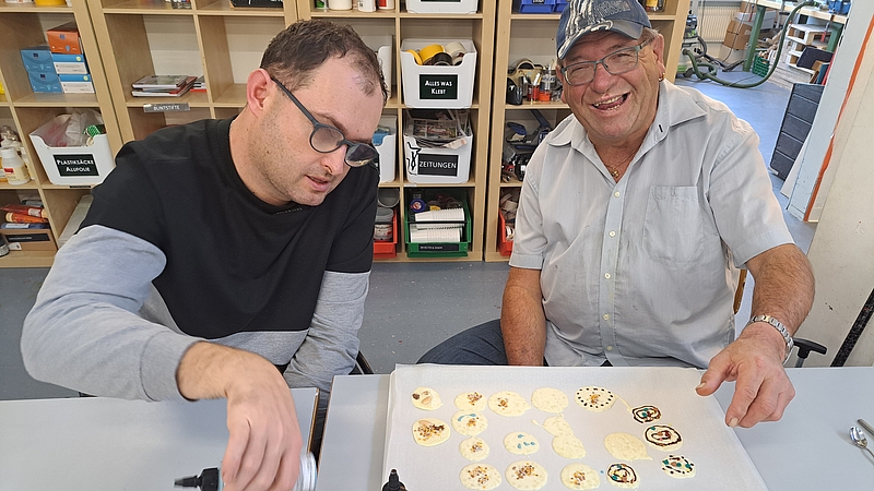 Die abgefüllten Säckli mit den von den Bewohner:innen und Klient:innen selbst bemalten Etiketten wurden an die Mitarbeiter:innen verteilt - wir sagen MERCI – die Pralinen sind köstlich!